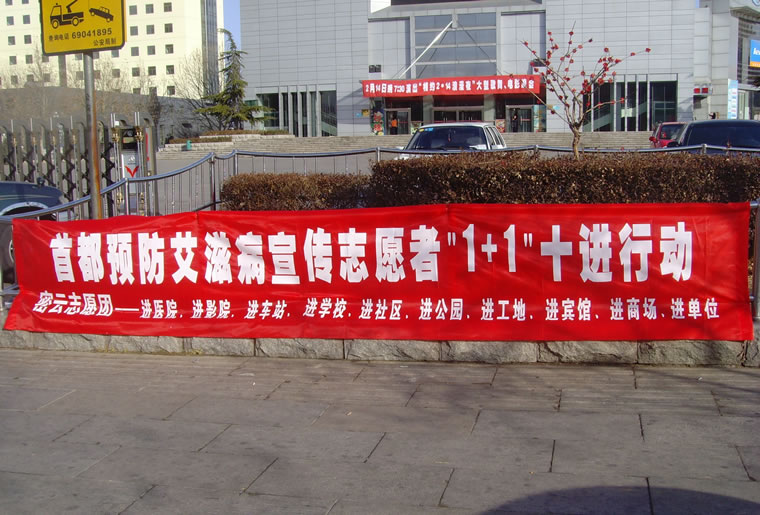 怀柔 志愿者将红丝带别在主题横幅上