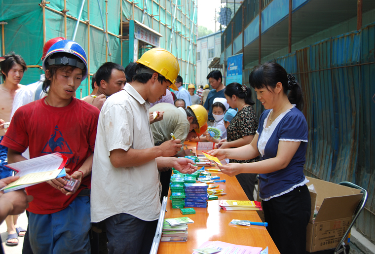 朝阳区三里屯办事处计生办工作人员向工人讲解防…