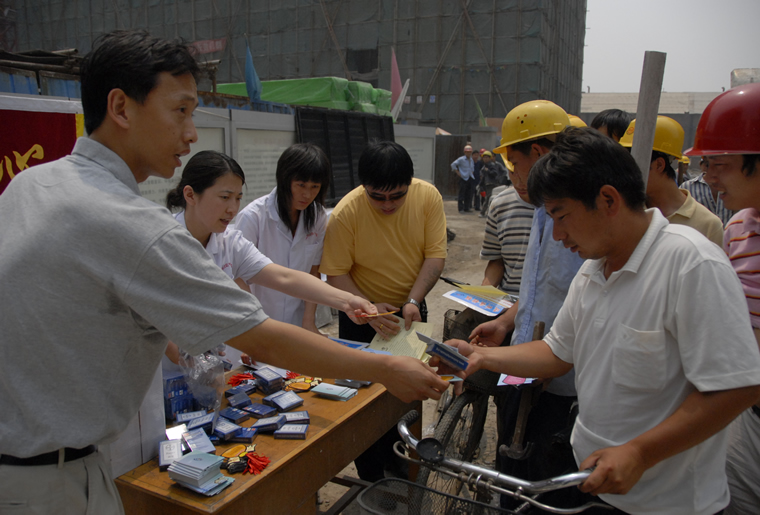 朝阳区三里屯办事处计生办工作人员向工人讲解防艾知识