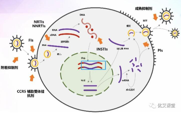 HIV-1复制周期中的整合阶段-病毒DNA整合到宿主细胞DNA上,导致HIV病毒无法彻底清除;而携带HIV前病毒的休眠细…