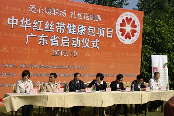 10月30日,红丝带健康包广东发放启动仪式在广州市番禺区锦绣香江花园的建筑工地内举行。广东省工商联副巡视员方苹、副处长张小华,广东省艾滋病防治研究所所长林鹏、广东省人保厅农工处副处长邱?,中华红丝带基金副秘书长叶大伟、香江社会救助基金会秘书长程瑶等出席了此次启动仪式。