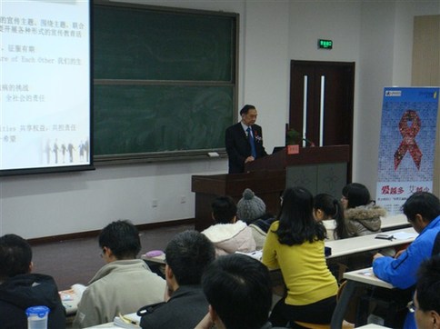 在北大活动现场,志愿者为入场的学生们发放红丝带并派发安全套。随后,主持人带领高校生举行了一个特殊的佩戴红丝带开场仪式,以表达高校学子对“世界艾滋病日”宣传活动的支持和对艾滋病病人的鼓励。本次公益讲座嘉宾北京性病艾滋病防治协会副会长唐耀武教授 , 引用大量数据说明我国艾滋病流行状况、防治工作及艾滋病基本知识等。联合国前秘书长安南表示:人类正面对着两个威胁,恐怖主义和艾滋病。与恐怖主义相比,艾滋病在过去一年里夺走了更多人的生命。至 2011 年,我国存活 HIV/AIDS 约 78 万人。 2011 年,新感染4.8 万,因 AIDS 死亡 2.8 万。我国正在扩大艾滋病监测检测覆盖面,加强对感染者配偶、一级密切接触者及高危人群的检测,加强医疗机构检测。与此同时,对艾滋病的治疗和干预也取得明显进展。