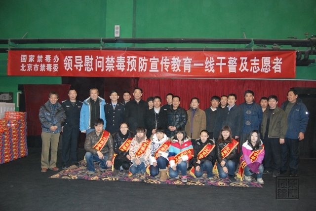2012年1月16日,公安部禁毒局副局长、国家禁毒办副主任陈绪富,国家禁毒办副主任、中国禁毒基金会秘书长陈兴友,公安部禁毒局预防宣传处处长宋增良,公安部禁毒局预防宣传处副处长王洪儒,公安部禁毒局两禁处副处长宫秀丽等一行,与北京市禁毒办常务副主任、北京市公安局禁毒总队总队长赵文忠,北京市禁毒办副主任、北京市公安局禁毒总队政委金志海,北京市禁毒办副主任、北京市禁毒教育基地主任刘杰等北京市禁毒办领导一同来到了北京市禁毒教育基地,慰问首都一线禁毒干警和禁毒志愿者。
