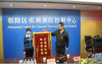 本次慰问活动由区疾病预防控制中心党委副书记周连红主持。首先由疾控中心工作人员介绍了目前朝阳区“四免一关怀”工作的落实和感染者管理工作情况。随后,感染者代表介绍了目前生活的情况和面临的困难。一位感染者还向疾控中心性防科赠送了锦旗,特别感谢疾控中心工作人员给与的帮助及一直以来的关怀和陪伴。周书记鼓励感染者不要为过去痛苦,也不要对未来迷惘,积极面对现在的生活。区红字会苏秀丽科长强调艾滋病防治需要各部门共同参与,希望和区卫生局、区疾控中心一起做好防艾工作,包括高危人群的健康宣教和感染者的心理支持等。随后,参会的各位领导为感染者代表发放了由区卫生局、区民政局和区红十字会提供的慰问金。区卫生局疾控科张菁科长还向大家分享了对艾滋病认识的心路历程,指出艾 滋病就像高血压、糖尿病等慢性病一样,希望感染者积极面对生活。最后,周书记指出,防艾工作需要每个人从我做起,希望感染者们能够树立战胜疾病的信心,履行自己应尽的义务,防止病毒的再次传播。