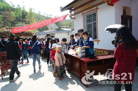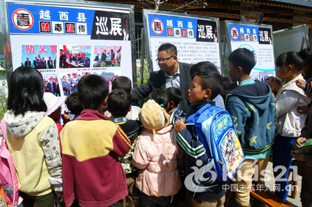 节目过后越西中学师生对马拖乡中心校40名品学兼优的学生发放了书包、文具盒、笔记本等奖品,对其余100多名小朋友发放了签字笔、作业本、棒棒糖等小礼品,对当地父老乡亲也派发了牙膏、香皂等生活用品,并组织在场学生和群众观看了“禁毒防艾”展板。