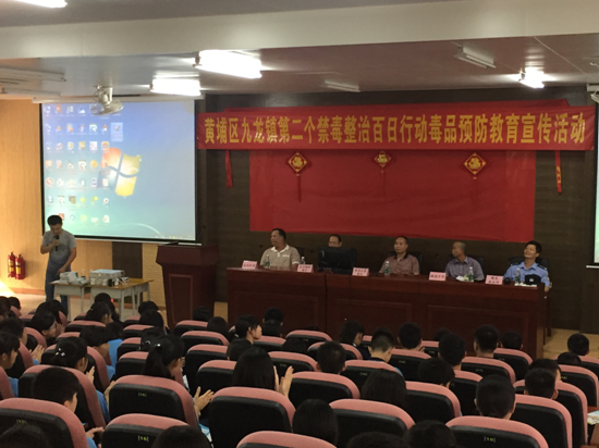 为使全体师生深刻认识毒品给国家、社会、家庭和吸毒人员自身带来的严重危害,强化师生禁毒意识,提高师生识毒、防毒、拒毒能力,促进校园和谐稳定。10月26日下午,九龙镇联合区禁毒区在镇龙中学开展第二个禁毒整治百日行动“我们的青春之约:远离毒品放飞梦想” 毒品预防教育宣传活动,镇党委副书记姚锦全同志、区禁毒办、镇综治维稳和信访办、镇龙派出所领导和镇龙中学全体师生约700多人参加了此次活动。
