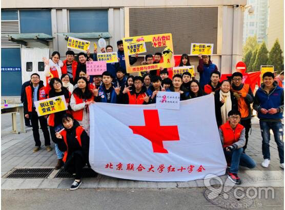 联合大学红十字会的防艾志愿者身着橙蓝两款衣服,手持宣言牌和防艾宣言合影,用轻松诙谐的方式推广防艾知识。