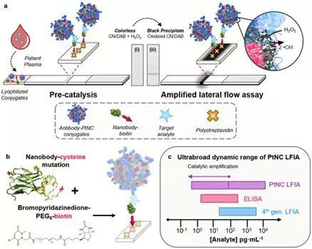 具体而言,将血清或血浆样品加入到一个容器中,该容器含有经过抗体修饰的铂核壳纳米催化剂(platinum core–shell nanocatalyst, PtNC),以及经过生物素修饰的骆驼抗体,其中骆驼抗体和PtNC携带的抗体特异性地结合到p24的不同位点上。随后,一种由硝酸纤维素反应膜和吸附垫组成的侧流试纸条通过毛细管作用让这种容器中的样品溶液流向这种试纸条上的携带着链霉亲和素的测试线。当p24存在于样品中时,这种病毒组分就能够与这种抗体- PtNC偶联物和经过生物素修饰的骆驼抗体发生反应,形成一种携带着生物素的复合物,即生物素-骆驼抗体-p24-抗体- PtNC,这种复合物能够被携带着链霉亲和素的测试线捕获。接着加入过氧化氢和一种生色底物(chromogenic substrate),在PtNC的高效催化下,过氧化氢氧化这种生色底物,从而产生一种不可溶的有色产物,这样,就可通过肉眼或手机摄像头加以观察。