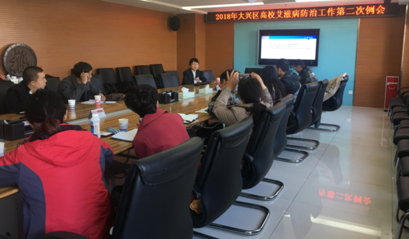 本次会议由区疾控中心性艾科科长张霁颖主持。会上,张科长首先介绍了大兴区2018年1-10月艾滋病疫情概况,并对各学校艾滋病防控工作开展情况进行了总结和肯定,通报了互联网+尿液匿名检测工作进展,动员各学校继续团结协作,发挥特长,结合自身特点,积极组织多种形式的艾滋病宣传和培训工作。最后,向各学校布置了2018年世界艾滋病宣传月及主题宣传日的宣传工作要求。