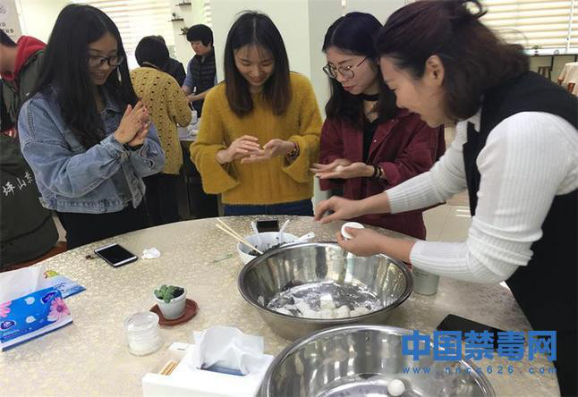 图为禁毒社工与居民一起包汤圆。中国禁毒网发
