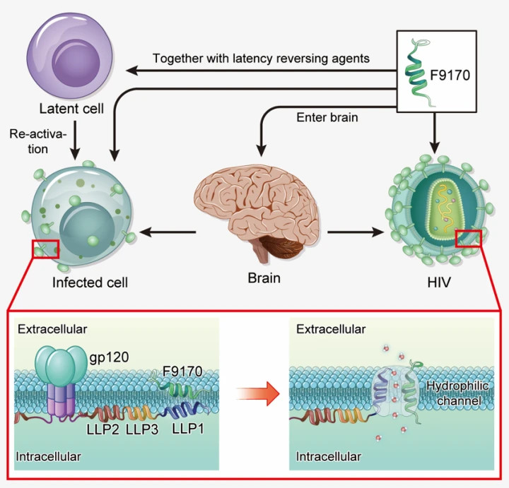 进一步的机制研究表明, F9170靶向HIV包膜蛋白胞内区LLP1结构域,多肽与Env胞内区的相互作用在病毒包膜上形成亲水通道,最终使得HIV的基因组释放,失去感染能力。该多肽同时也能作用于表达了HIV Env的HIV感染细胞,以及激活后的HIV储存库,引起感染/激活细胞的坏死,所以F9170或将有望与储存库激活剂一起用于HIV感染的治愈。