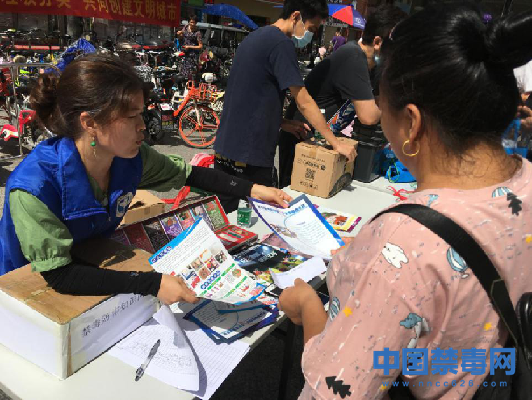 图为禁毒社工向过往群众发放禁毒宣传单。中国禁毒网发