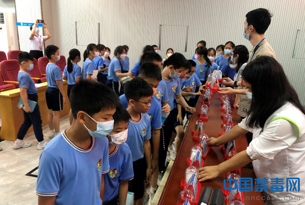 图为禁毒工作人员向学生展示毒品仿真模型。中国禁毒网发