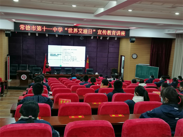 12月1日,常德市第十一中学在学校多媒体教室开展“世界艾滋日”主题宣传教育活动。活动现场通过讲座和发放宣传资料等形式开展宣传活动。学校心理健康管理中心田金秀老师给同学们上了一堂别开生面的宣传教育讲座。根据疫情防控工作要求,七、八、九年级各班选派了部分学生代表参加本次讲座。