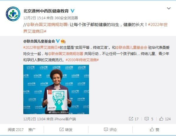今年世界艾滋病日宣传活动主题为“共抗艾滋,共享健康”,在12月1日在院挂号大厅电子屏上展示世界艾滋病日主题内容供来院人员观看了解;利用院内健康教育微博宣布世界艾滋病日发布相关知识内容共8条;在院内微信群分享艾滋病相关知识进行了院内人员的宣传。