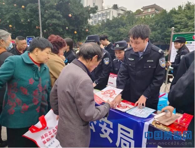图为民警向群众发放禁毒宣传单。中国禁毒网发