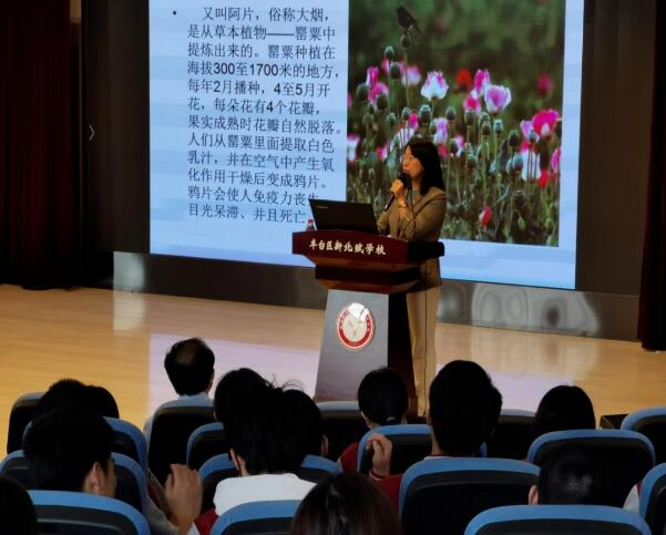 花乡街道办事处联合北京天康戒毒康复所在新北赋学校开展禁毒宣传活动。戒毒所民警现场讲解毒品的种类、危害及防范方法,并通过问答互动、图片以及毒品仿真模型等形式,让同学们直观地了解了毒品及其危害,提醒学生们要树立正确的人生观,不仅要自己远离毒品,遇到可疑人员的,在确保自身安全的情况下,还要及时向公安机关举报,为建设无毒社会出一份力。