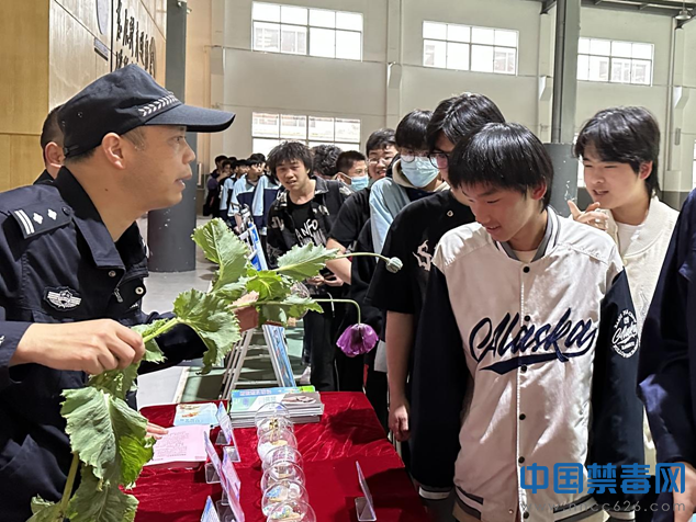 活动中,派出所民警利用禁种铲毒行动中缴获的罂粟向同学们讲解毒品原植物的特征及危害,并告诫同学们要远离毒品,珍惜花样年华。