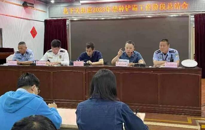 北下关街道召开禁种铲毒工作阶段总结会,街道办事处主管领导、派出所负责人、各社区以及地区重点单位负责人出席。会议要求:一是认真总结前一段时间的工作,发现问题及时整改,不留死角,对重点人、易发点位进行重点检查;二是做好宣传发动,各社区要广泛开展禁种铲毒宣传活动,力争做到人人皆知、家喻户晓;三是全力做好踏查铲毒工作,各社区要加大踏查、摸排打击力度,对辖区公园、绿地、社区楼前楼后绿地、空场及平房院落等重点地块开展实地走访踏查,切实做到“早预防、早发现、早铲除、严追责”,严防发生毒品原植物非法种植问题。