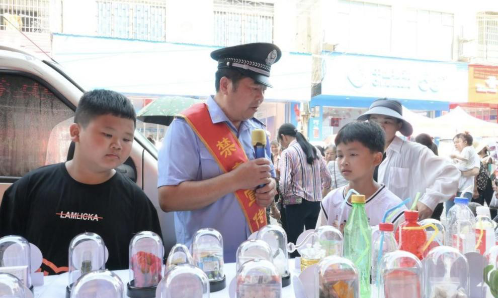 “叔叔阿姨,今天是6月26日国际禁毒日,我们在这里进行禁毒宣传,这里有仿真毒品样品,像海洛因,K粉,摇头丸等多种毒品类型,大家可以近距离观看学习。”工作人员热情地解答群众的疑问,并向群众发放禁毒宣传资料和环保袋,引导群众观看宣传展板,深入了解毒品的危害,提高群众识毒、防毒、拒毒意识。