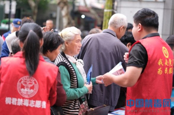 图为禁毒办工作人员向群众发放禁毒宣传资料。中国禁毒网发