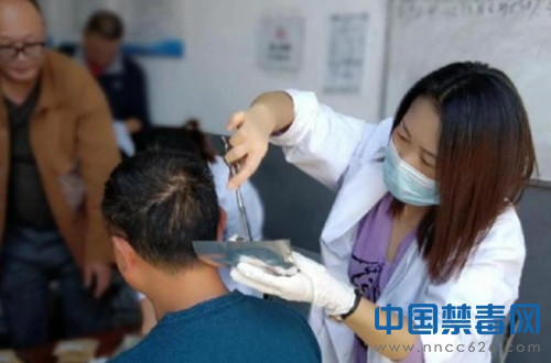 图为工作人员向驾驶员采集毛发。中国禁毒网发