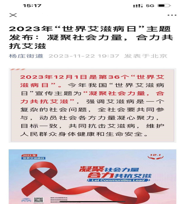 为深入做好艾滋病防治知识的宣传教育工作,增强居民群众的自我保护意识,提高防范艾滋病的能力,促进和谐社会的健康发展,营造良好的艾滋病防治社会环境,在2023年世界艾滋日来临之际,通州区杨庄街道组织各社区、村开展多样式的宣传活动。