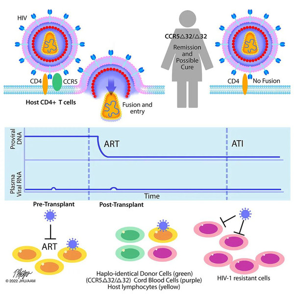 CCR5是HIV病毒入侵和感染人类细胞的受体,CCR5 Δ32/Δ32 基因突变后,细胞缺乏CCR5受体,HIV病毒也就无法感染。对于感染HIV病毒的白血病患者,首先通过化疗杀死癌细胞,在移植具有CCR5 Δ32/Δ32 基因突变的造血干细胞,有可能在治愈白血病的同时,让患者体内的HIV病毒无法感染,从而逐渐清除HIV病毒,实现艾滋病的长期缓解,甚至是治愈。