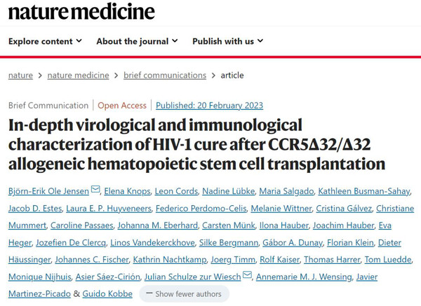 2023年2月20日,德国杜塞多夫大学医院等机构的研究人员在国际顶尖医学期刊 Nature Medicine 发表了题为:In-depth virological and immunological characterization of HIV-1 cure after CCR5Δ32/Δ32 allogeneic hematopoietic stem cell transplantation 的论文【3】。