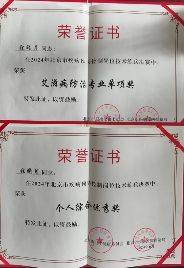 由北京市卫生健康委员会、北京市疾病预防控制局组织举办的北京市疾病预防控制岗位技术练兵个人决赛于6月22日在北京市疾控中心南院举行。为贯彻落实《北京市疾病预防控制岗位技术练兵实施方案》,提高本中心从业人员知识储备及突发事件应急处置能力,性病艾滋病防科经过科室及辖区内选拔,选派张曦月同志参加此次全市技术大练兵个人决赛。此次竞赛分为笔试和技能两部分,其中笔试部分由6大专业(传染病防控、艾滋病防治、结核病防治、免疫预防、卫生应急、消毒和病媒生物防制专业)组成,技能操作部分分专业进行。经过1天的角逐,张曦月同志在此次比赛中表现优异,分别获得了个人综合优秀奖和艾滋病防治专业单项奖。
