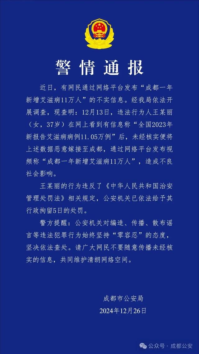 12月26日,成都市公安局发布“警情通报”称,造谣“成都一年新增艾滋病11万人”的王某丽(女,37岁),被给予行政拘留5日的处罚。