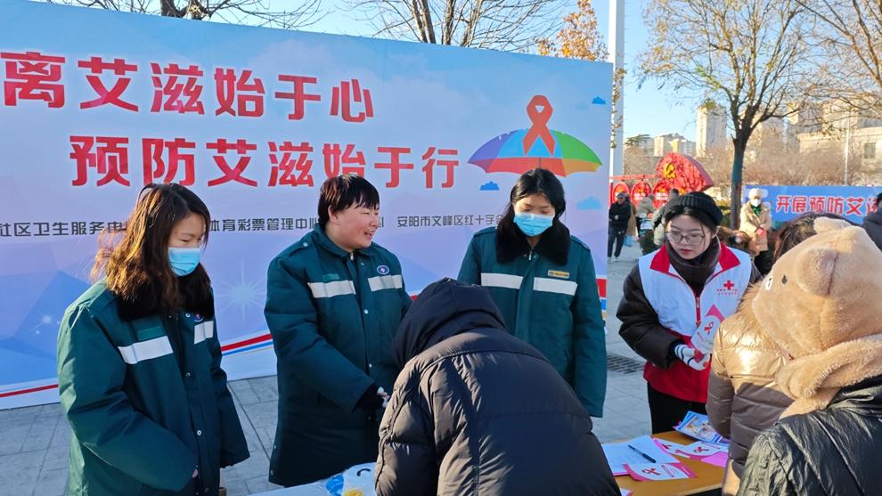 冬日暖阳下,安阳市平原路聂村广场上一片热闹景象。河南体彩安阳分中心联合国家级体彩公益金使用单位安阳市文峰区红十字会、东关街道办事处社区卫生服务中心等多部门,在这里举办主题为“远离艾滋始于心 预防艾滋始于行”的公益宣传活动。活动现场,体彩公益金支持的这一暖心举措,让防艾知识如春风化雨般深入社区居民心中。