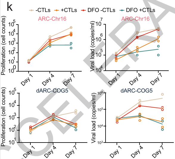 图 | 使用 FDA 批准的药物去铁胺(DFO)预处理可提高细胞内氧化应激水平,成功使抗性克隆对 CTL 杀伤重新敏感,显著抑制了克隆扩增并降低了病毒释放量(来源:论文)
